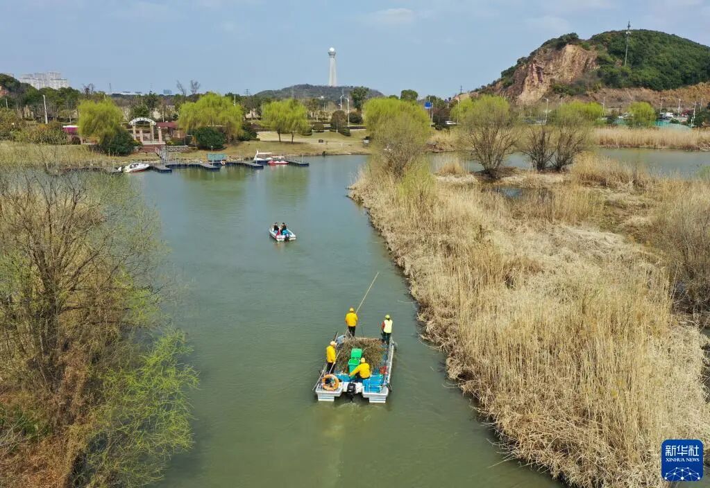 浙江省湖州市吴兴区八里店镇移沿山村河长带队在移沿山村开展巡河、保洁作业(2021年2月24日摄,无人机照片)。新华社记者 翁忻旸 摄