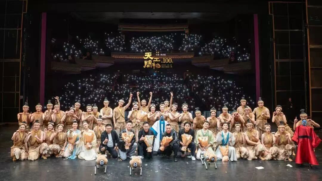 演出当晚,宇树科技机器人、机器狗与演员共同登台谢幕,呈现了一场跨越文化艺术与科学技术共舞的盛景。科技感十足的机器狗、机器人随着谢幕音乐的节奏精准舞动,与艺术家们默契互动,时而列队致意,时而模仿舞蹈动作,其灵活的步态与精准的控制引得现场掌声雷动。这场跨越四百年的“天工”对话,完成了从古代工匠精神到现代人工智能的时代接力。
