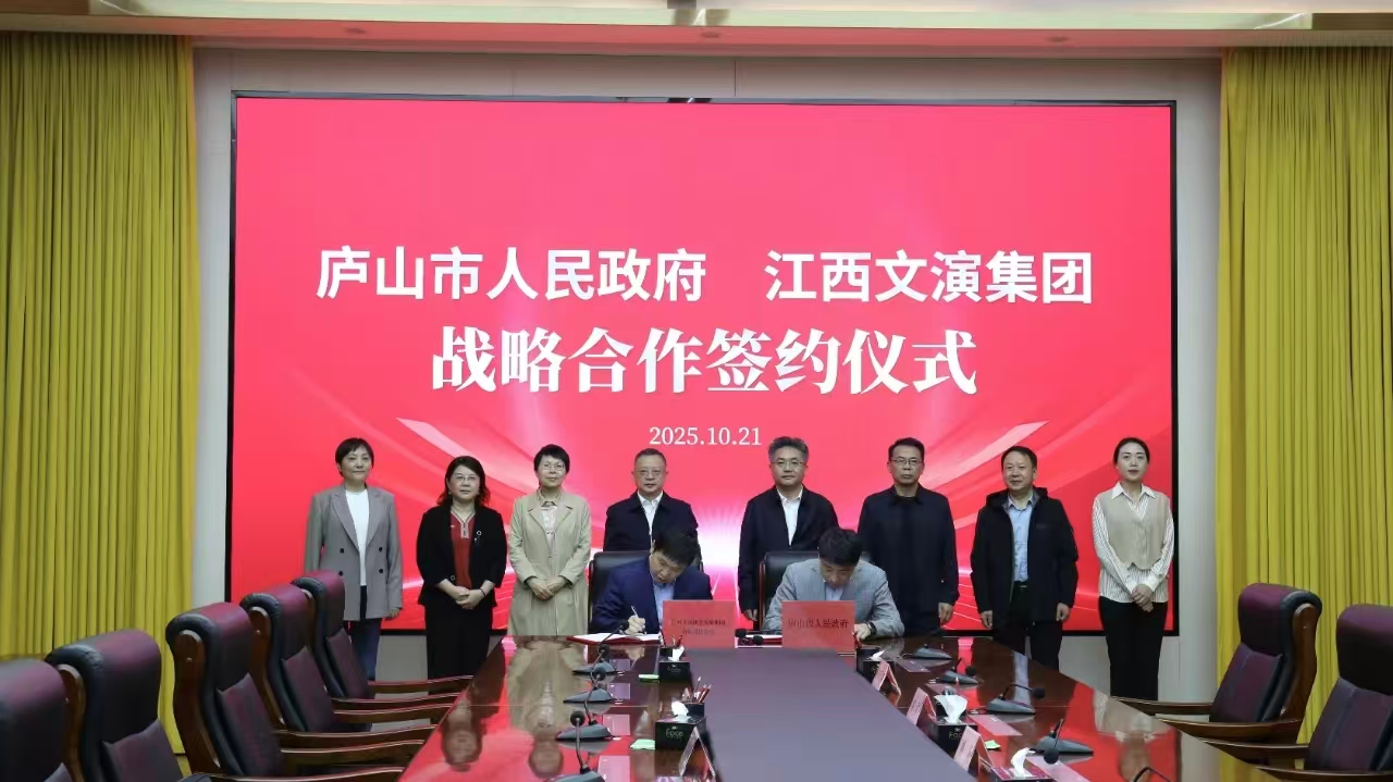 2025年10月21日下午,江西文演集团与庐山市人民政府在庐山正式签署战略合作协议,标志着双方在推动文旅产业深度融合、助力区域经济高质量发展方面迈出实质性步伐。此次合作不仅是落实江西省“文化强省、旅游强省”战略部署的关键举措,也为庐山文旅业态的创新升级注入了强劲动能。贾樟柯导演团队受邀出席活动。庐山市领导邵九思、熊杜明,集团领导徐光华、李瑞峰、刘小玲、熊丽华出席。熊杜明与李瑞峰分别代表双方签署战略合作协议。
