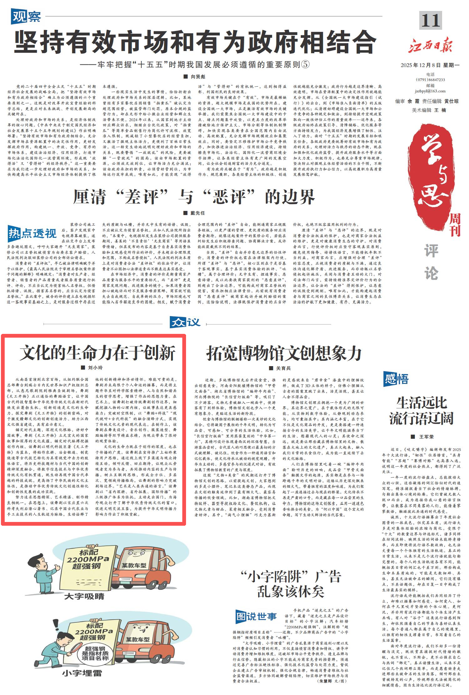 从南昌首演到北京百场,从纽约联合国总部舞台到瑞士日内瓦世界知识产权组织总部,从悉尼歌剧院到雅典圣诞剧场,舞剧《天工开物》正以通俗的舞蹈语言,让中国古代科技智慧和中华优秀传统文化在新时代焕发出蓬勃生机。创新创造是文化的生命力。探究舞剧《天工开物》的创新密码,对于激发赣鄱文化的创新创造活力、助力江西文化强省建设,具有启示意义。
