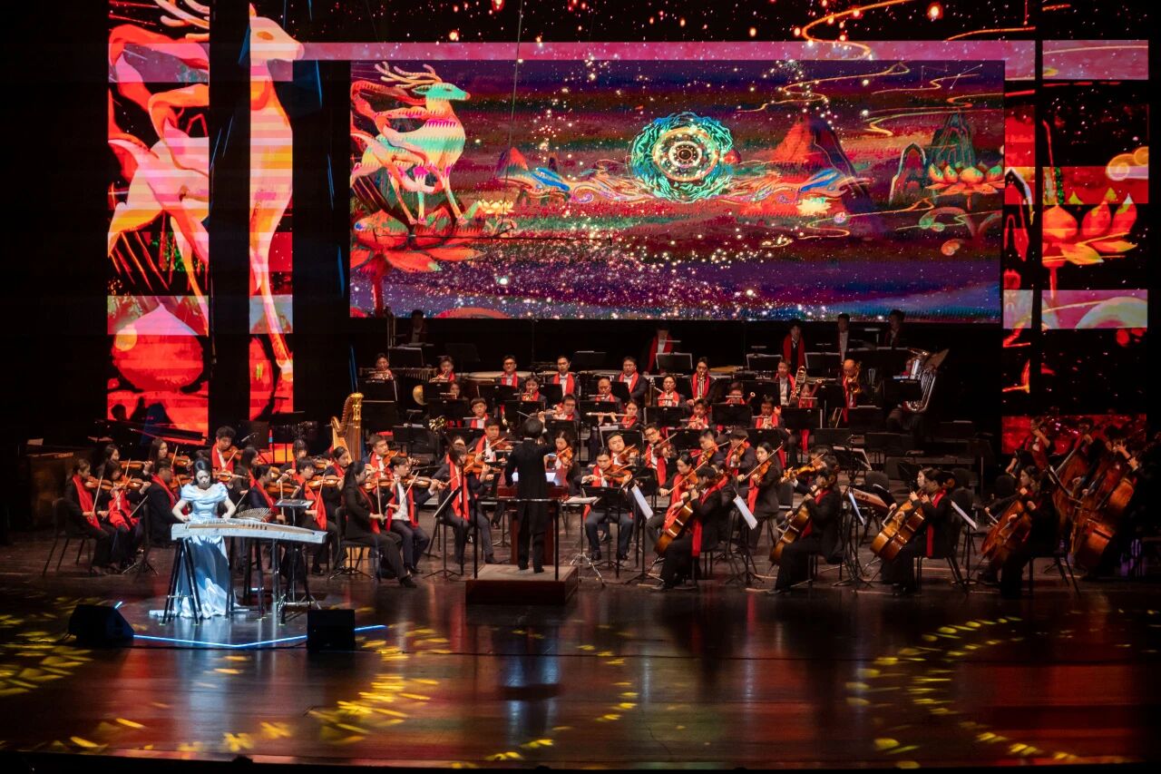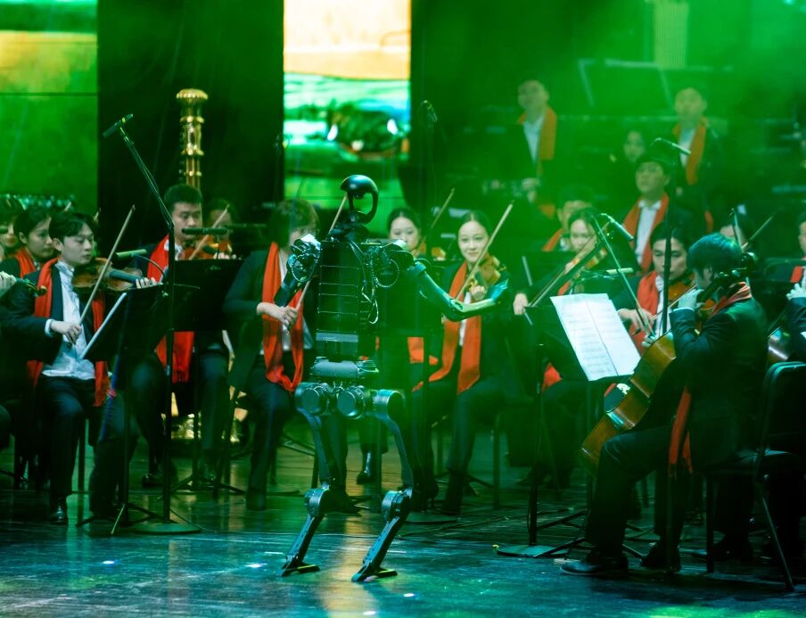 演出开场,AI机器人“智音”登台执棒,瞬间点燃全场好奇与期待。由人工智能作曲系统生成的《欢迎》序曲轻快灵动,《千里江山图》的意境则随音符徐徐铺展,算法与旋律的巧妙融合,让观众领略到未来音乐的无限可能。随后,青年古筝演奏家张雨轩带来协奏曲《群星闪耀时》,温婉的琴音,与在AI技术加持下层次分明的乐团伴奏声交织,传统与现代在舞台上和谐共鸣,赢得热烈掌声。