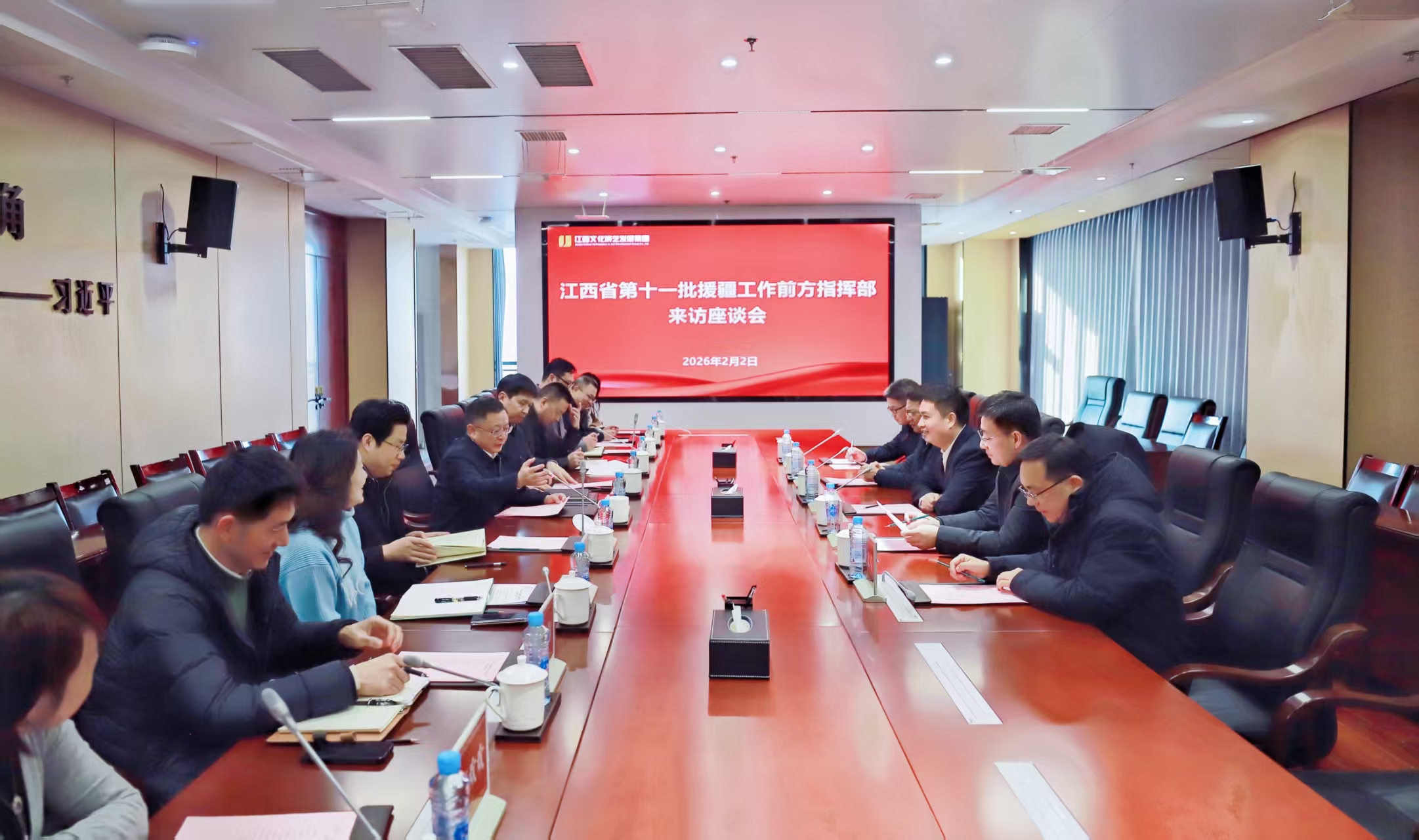2月2日下午,江西文演集团党委书记、董事长徐光华,党委副书记、副董事长、总经理李瑞峰会见江西省第十一批援疆工作前方指挥部党委书记、总指挥赖晓军一行,双方就深化文化润疆合作、推动赣疆文化交流交融进行座谈交流。江西援疆前指党委委员、副总指挥郭卫泉,党委委员、干部人才组组长拱明;文演集团副总经理胡志坚参加。