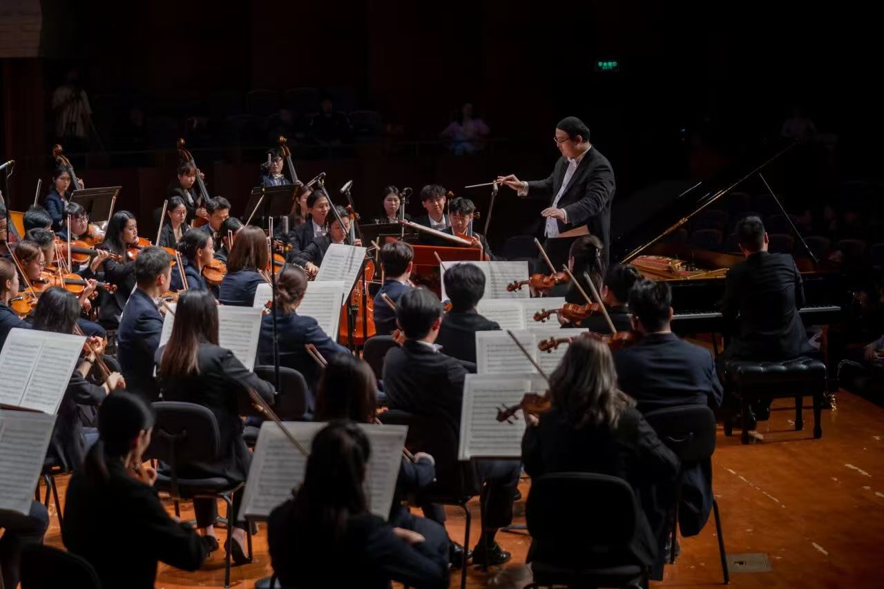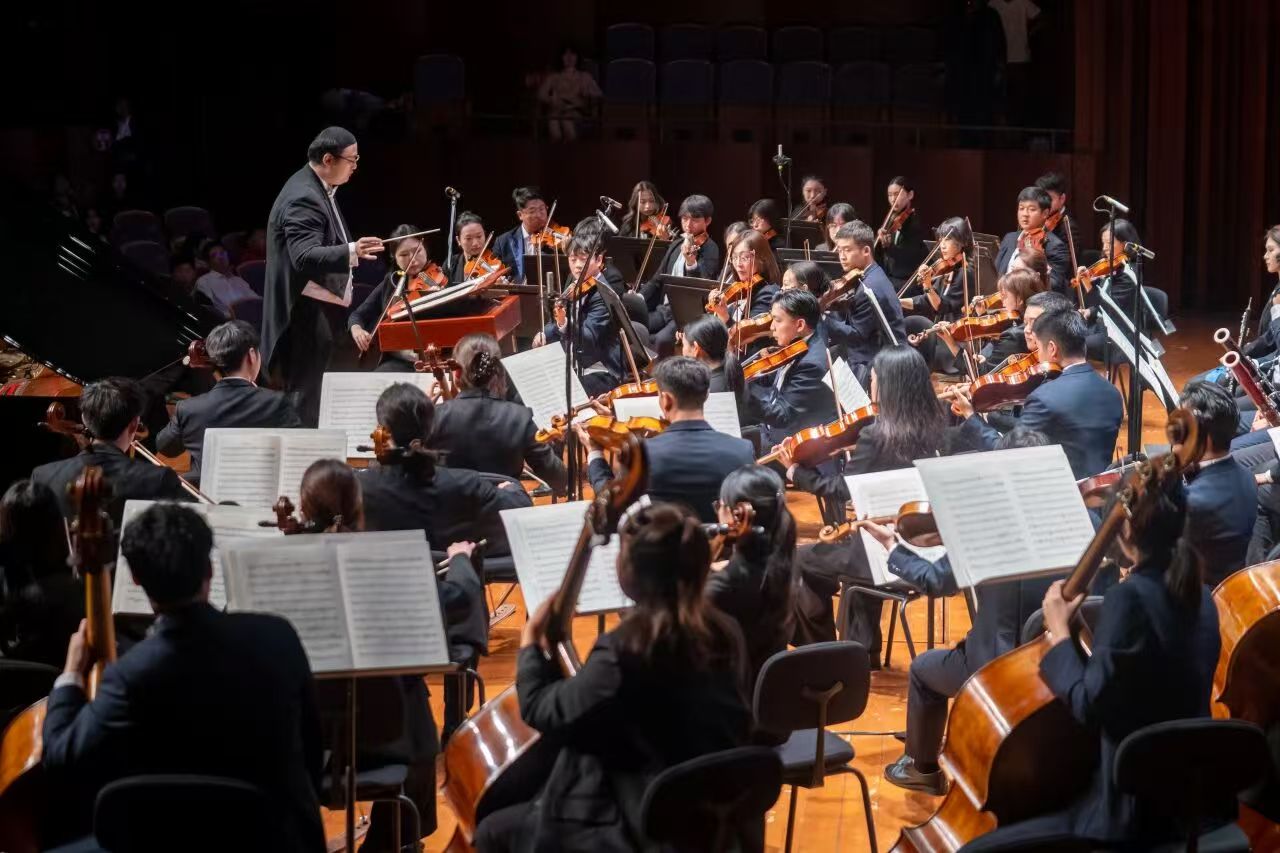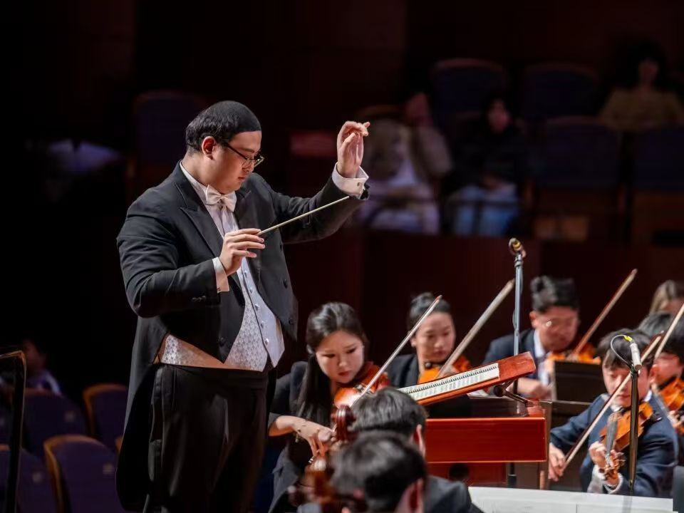 第一乐章“庄严的快板”中,乐团先以合奏铺陈主题,黄若愚的钢琴随即以清亮音色切入,在木管的柔和引导下重现主题旋律。当乐曲转入小调段落时,他的触键骤然轻柔,在指尖流淌出转瞬即逝的幽暗,随后又在大调的回归中重归明朗。最令人动容的是第二乐章“行板”,在黄若愚的演绎下如月光洒落。他与加弱音器的弦乐精准配合,三连音伴奏贯穿始终,钢琴与管弦乐的对唱时而温柔絮语,时而深情回应。终章“非常活泼的快板”中,他的手指如行云流水,在快速音阶与乐队的互动中,完美呈现了莫扎特特有的均衡感,最后以排山倒海的上行音阶收尾,赢得全场掌声。